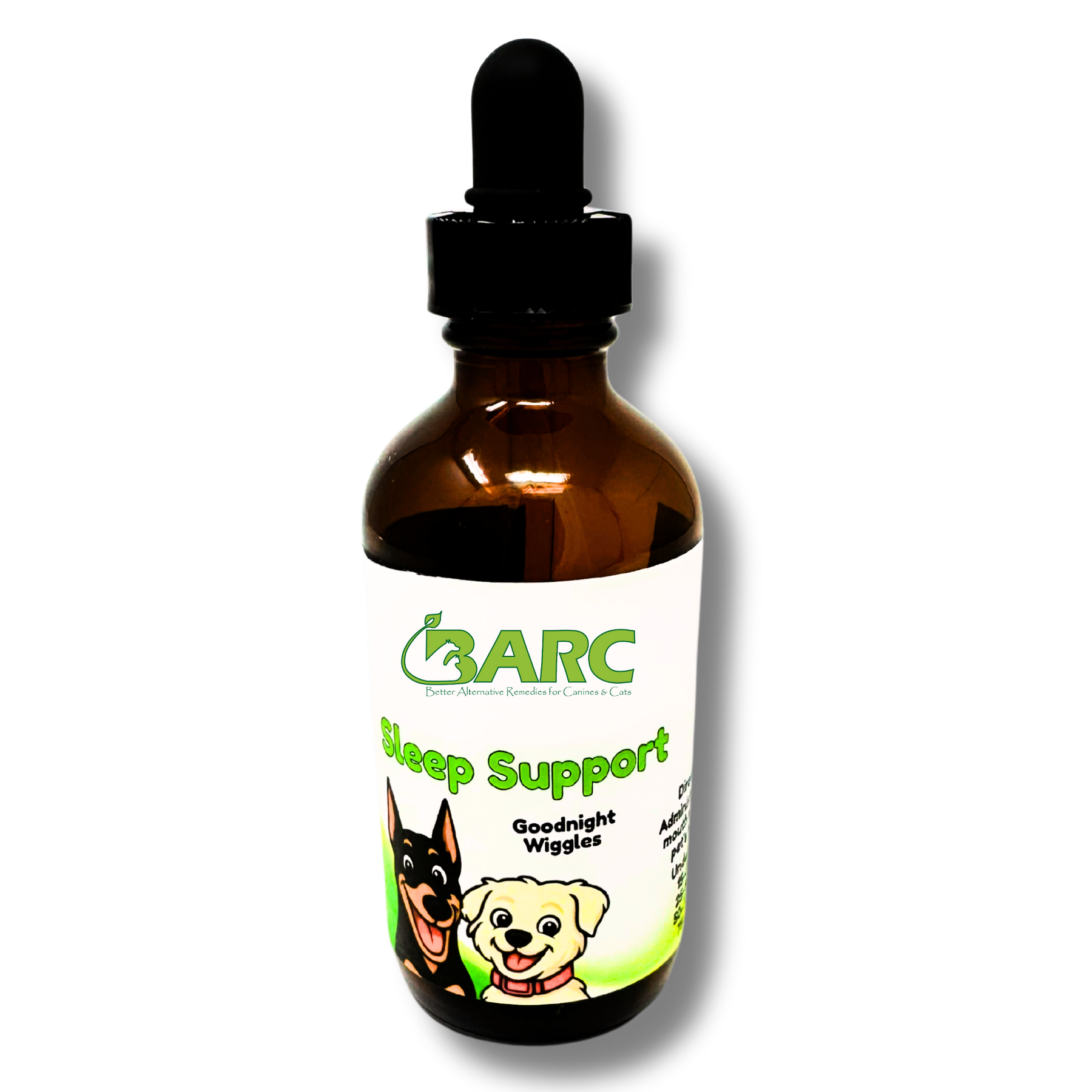 Goodnight Wiggles!  Sleep Support is a gentle, plant-powered tincture formulated to help pets relax, settle down, and enjoy a deeper, more restorative night’s sleep. It supports both the nervous system and natural sleep cycle, helping reduce nighttime anxiety, restlessness, and sleep disruption.